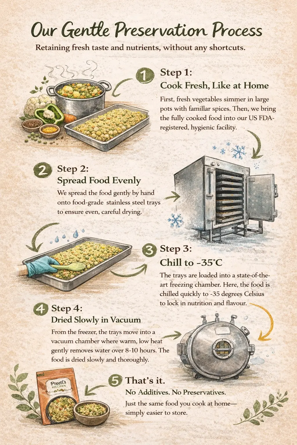 You cook the food fresh → bring it to us → we dehydrate and pack it → you carry it when needed.